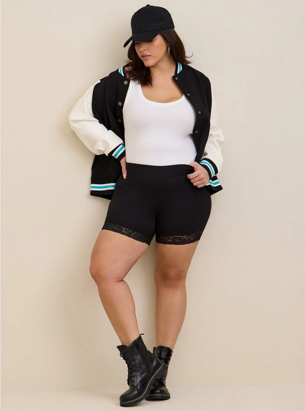 Stretch-knit fabric and a thick waistband work together to hold you in and smooth you out in our signature bike short that’s updated with a lace trim.