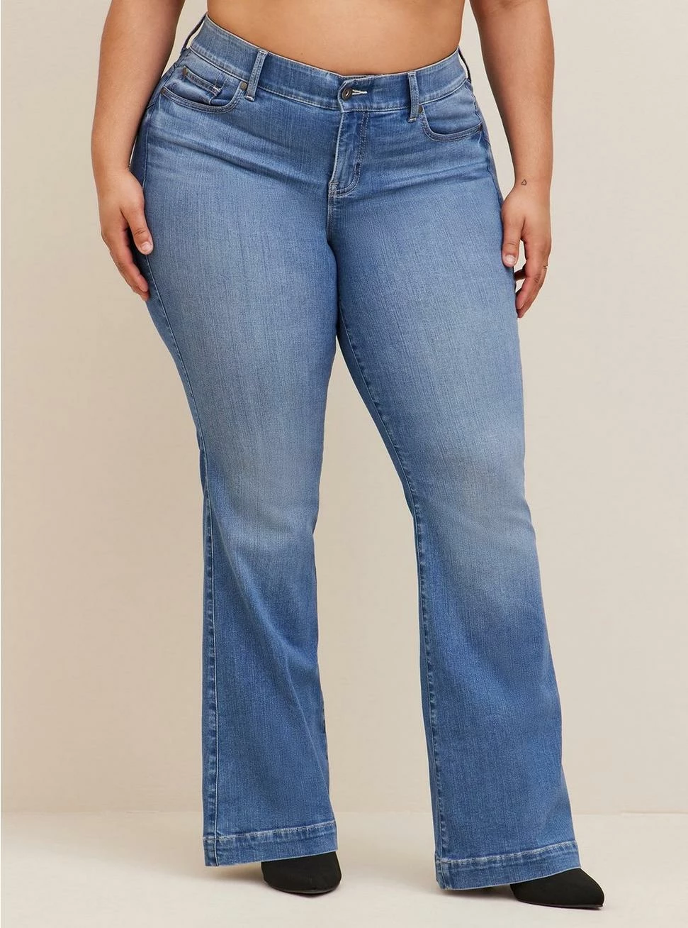 - High rise. Slim fit from hip to thighs, then kicks out into a wide flare.
