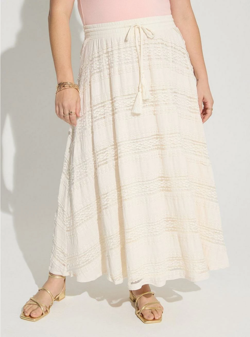 Get all lovely in lace with this maxi skirt featuring an elastic self-tie tassel front.