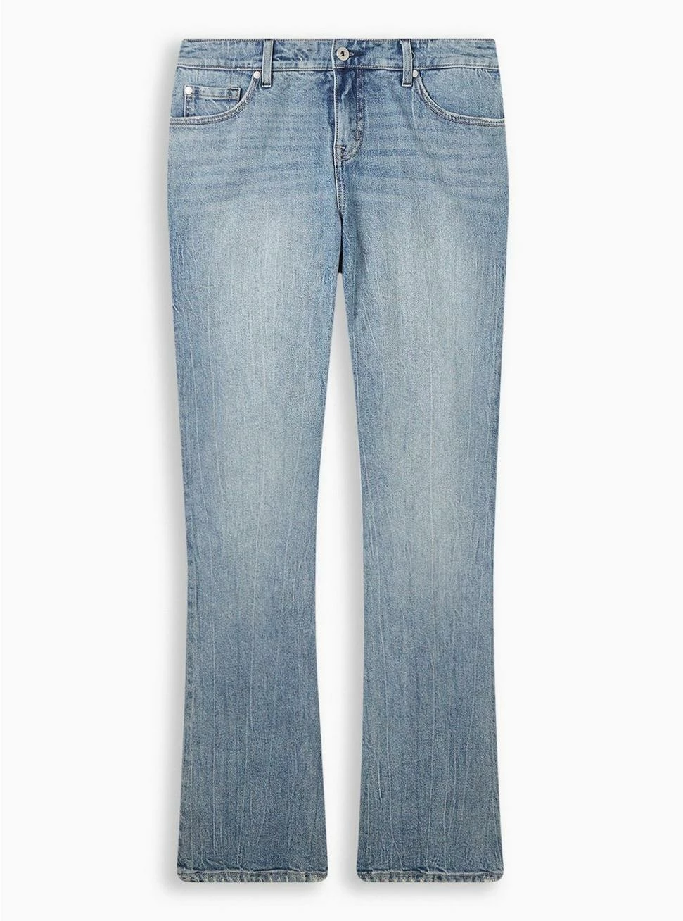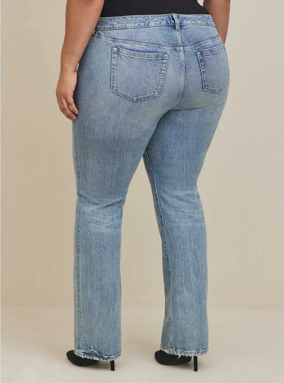 - Mid-rise. Slim fit through the knee, then kicks into a mini flare.