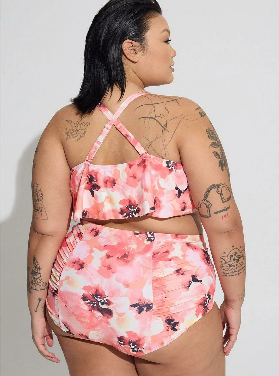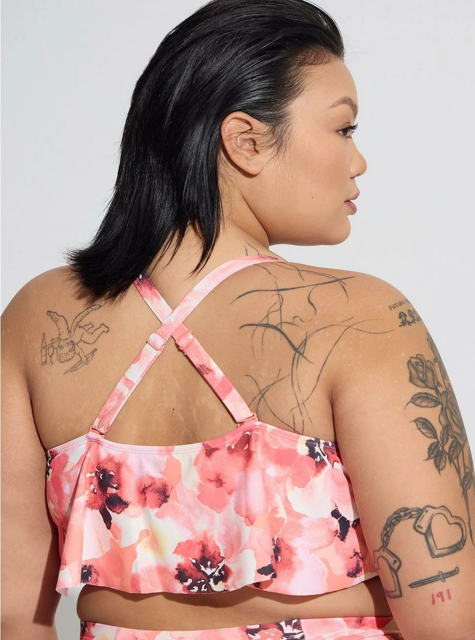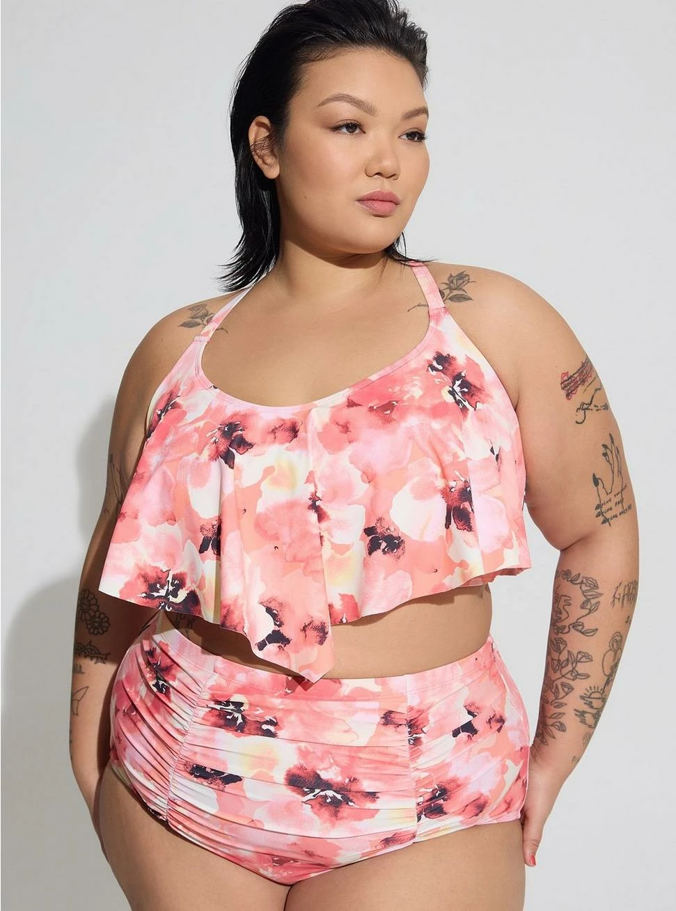 - Flattering v-flounce neckline.